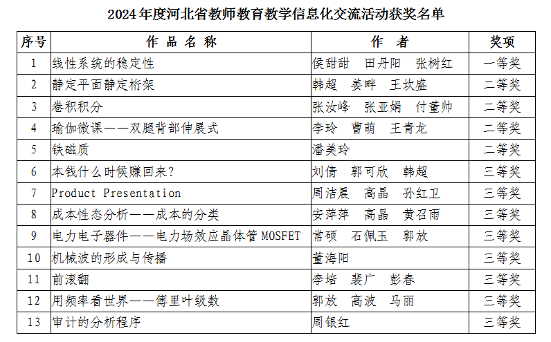 近日,河北省教育厅公布了2024年度河北省教师教育教学信息化交流活动结果,我校共13项作品获奖,其中一等奖1项,二等奖4项,三等奖8项。侯甜甜老师带领的团队作品被推荐参加国赛,这是我校首次在此项赛事中获选参加国赛。我校一直高度重视教学信息化建设工作,通过搭建智慧教育平台、加强在线课程资源建设、开展教师教学信息化能力培训等举措,不断提升教师信息化教学能力和水平。今后,我校将以信息化交流、比赛为抓手,进一步加强教师教学信息化能力培养培训,...
