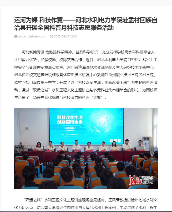 河北新闻网报道我校开展科普活动,受到广泛关注。为弘扬科学精神、普及科学知识,充分发挥学校高水平科研平台的人才与智力优势,近日,我校组织河北省岩土工程安全与变形控制重点实验室、河北省滨海湿地水资源调配及生态保护技术创新中心、河北省高校交通基础设施数智化应用技术研发中心的教师,赴沧州职业技术学院孟村学院及孟村回族自治县第三中学,成功举办了以“科技改变生活,创新改变未来”为主题的科普活动。活动通过“双遗之城”...