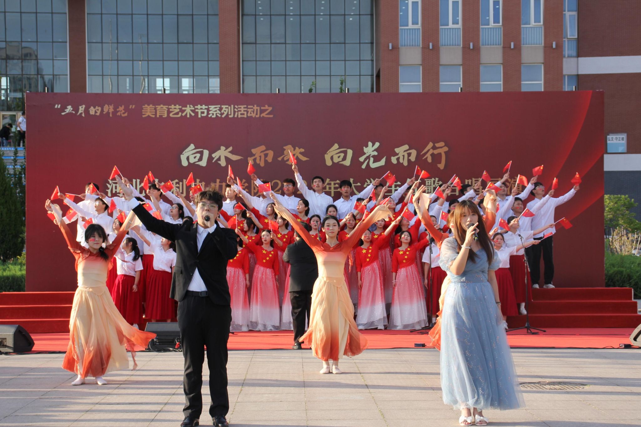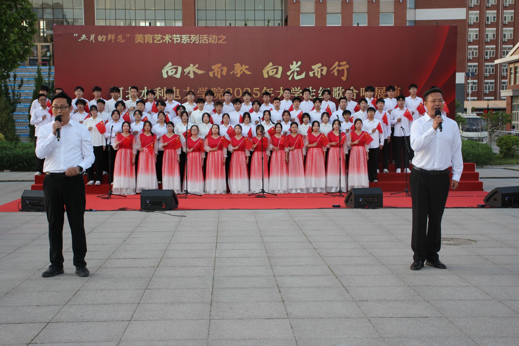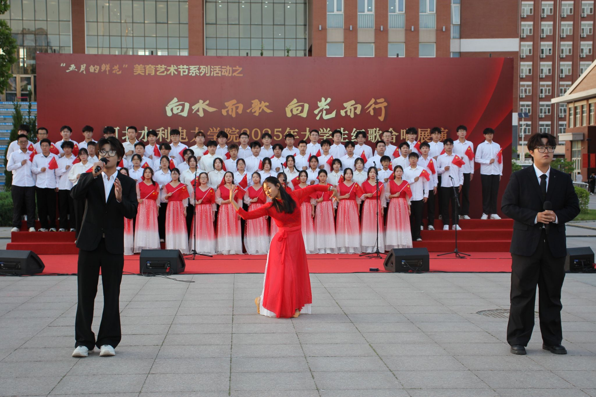 五月的校园,歌声嘹亮。青春的舞台,激情飞扬。5月15日下午,我校石材广场上红旗招展、歌声如潮,“五月的鲜花”美育艺术节系列活动之“向水而歌 向光而行”开云手机官方版在线入口2025年大学生红歌展演在此举行。校党委书记张效松,党委副书记、校长王滨,副校长于振海,副校长杨凯,纪委书记鲁增秋出席活动。